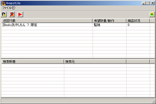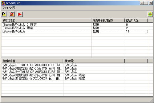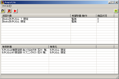 後は、巡回開始ボタンをクリックすると、AregistLiteがアマゾンにアクセスし、タイトル検索を行った結果の数が増えていた場合、メールで連絡してきます。
